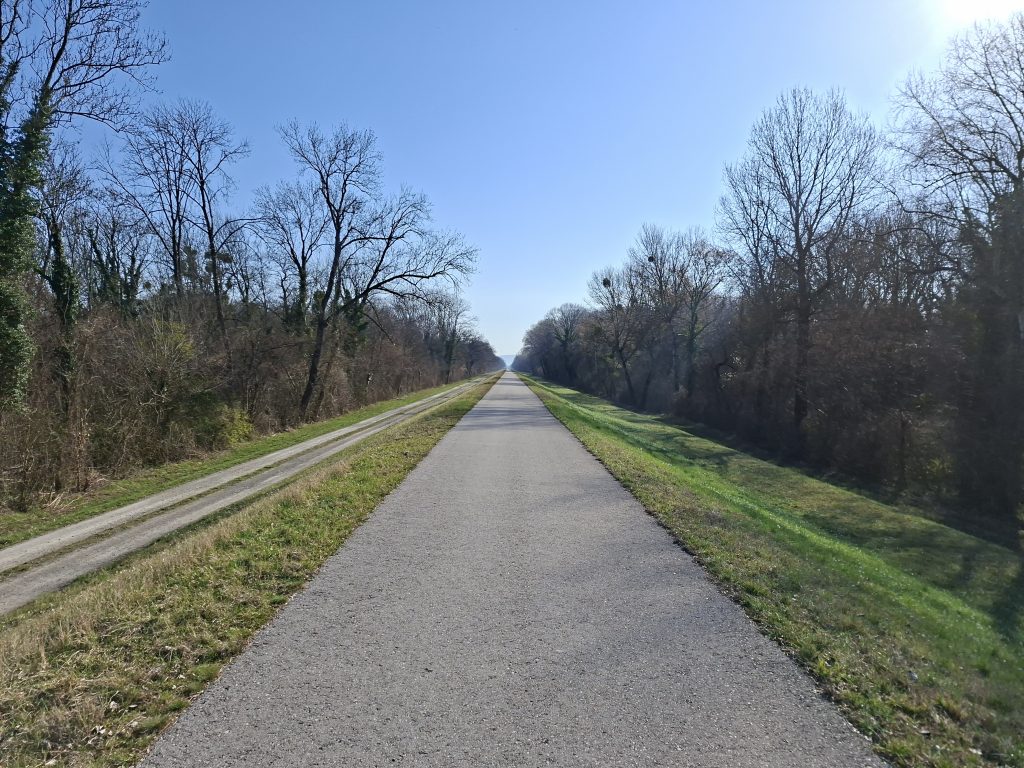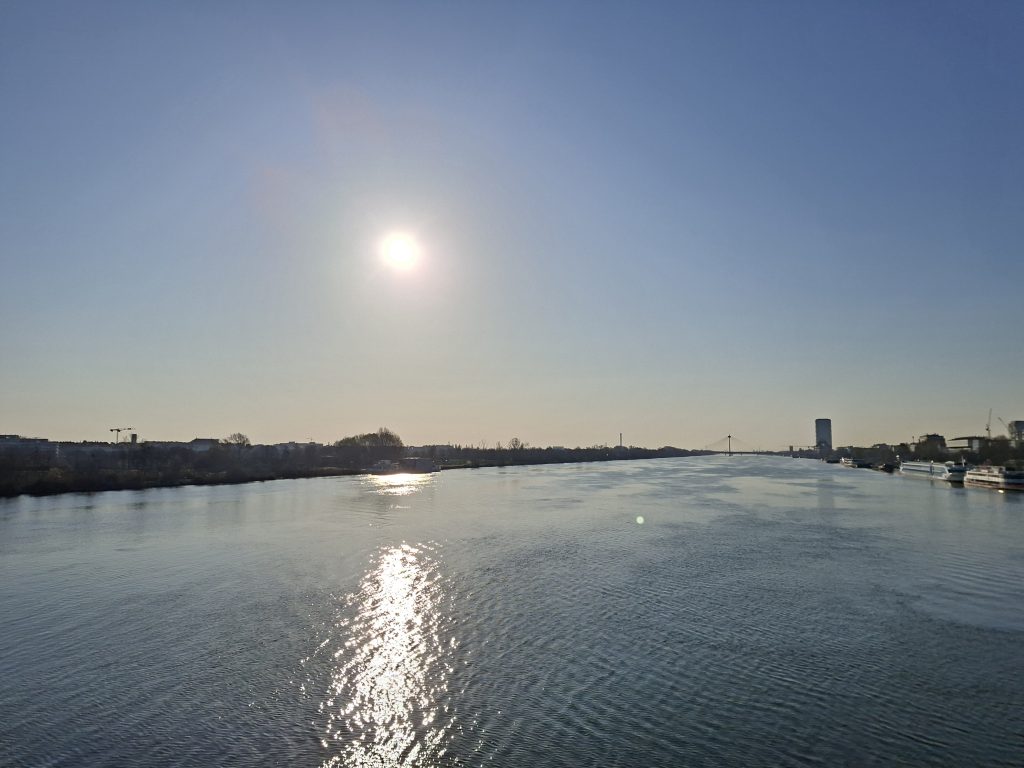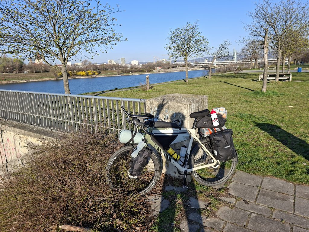 I started early this morning because I had planned a few kilometres. Shortly after 7.30 a.m. I plunged into the morning traffic in Vienna. It wasn't that bad though - Vienna is a really great city for cycling. And after 2 kilometres I was already out of the city and back on the cycle path. There was hardly any traffic here, just a few commuters cycling to work even at 4 degrees Celsius. As I had forgotten the (obligatory?) start photo, I made up for it on the banks of the Danube with a view back to Vienna.