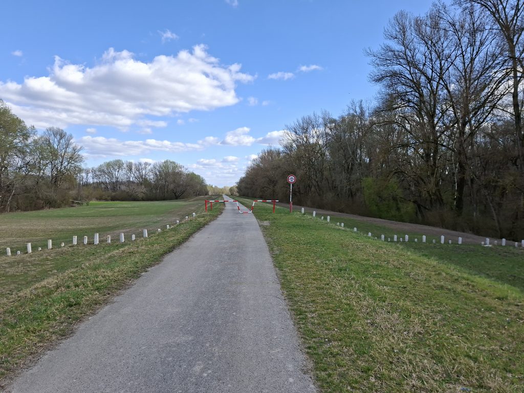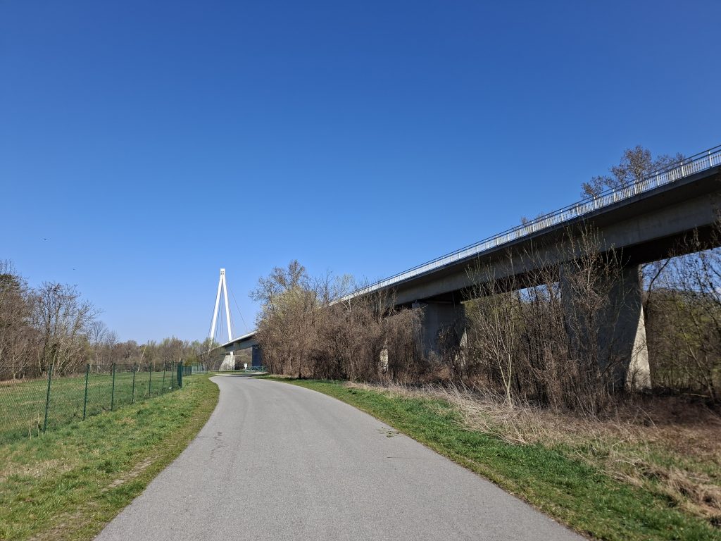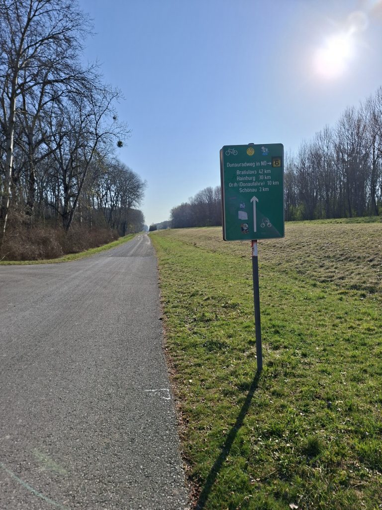 Afterwards, we first passed Vienna's oil reserves and then travelled through a nature reserve on what felt like an endlessly long straight. It was almost as monotonous as the weather - there wasn't a cloud in the sky at the start of the day. For a change, there was a bridge and a sign that tried to explain the cycle path situation - I was glad I had saved the route on my bike computer, the graphics confused me.