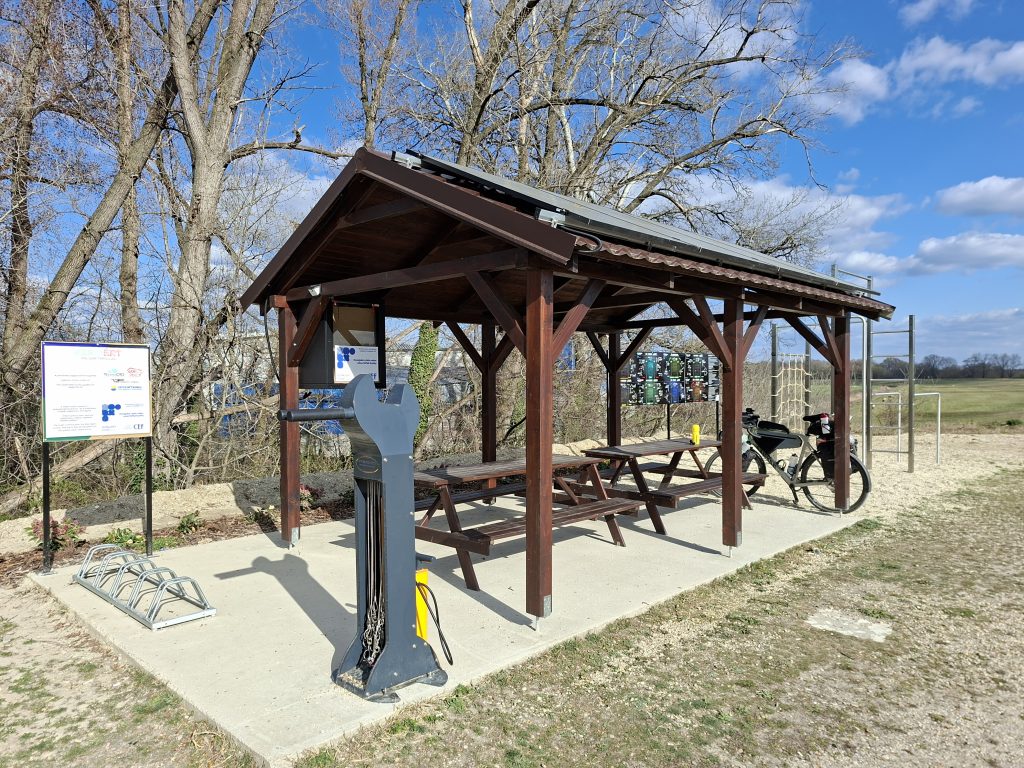 When the road went in a completely different direction, I took the next ascent back onto the flood defence dam where EuroVelo 6 was. I was relieved to see that the road was now tarmac again. The headwind remained. Slowly but surely, I wanted to take a second break. There wasn't really anywhere to sit down, and I was beginning to lose sight of the forest. But then suddenly there was a «rest stop», complete with bike service facilities. So I only took another break about 20 kilometres before Komárno. A good hour against the wind later I was back at the hotel - fortunately at a quarter past four. By the way: Yesterday everything was in German, today the receptionist didn't even speak English. The signs here are also in Slovakian and Hungarian - after all, the Danube is the border with Magyarország. The German shopping chain Lidl is also here, but one of the products I bought was labelled in all possible languages (including Estonian, Lithuanian, Slovakian, Hungarian, Romanian, Bulgarian, Greek and 3 other languages that I couldn't recognise from the abbreviation), just not German or English. Welcome to Slovakia :-).