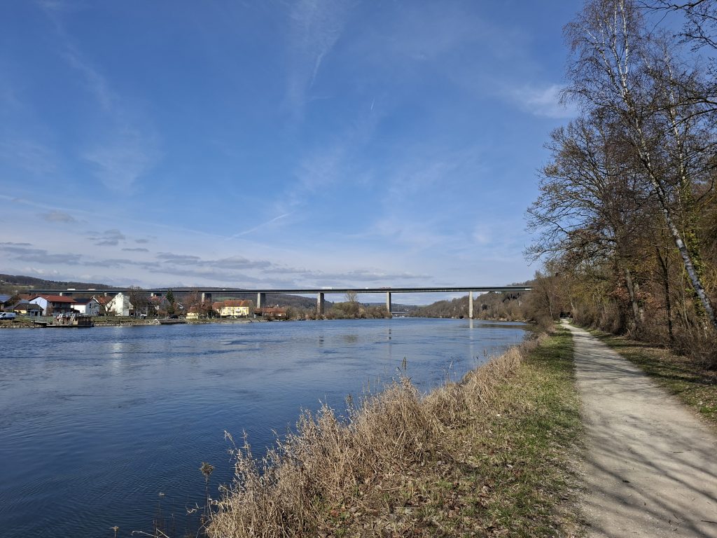 Nun standen noch knapp 40 km auf dem Programm bis Deggendorf. Der Donauradweg machte anfangs einen nigelnagelneuen Eindruck und entsprechend rollte es auch wieder super gut. Doch plötzlich versperrte eine Fahrverbotstafel den Weg, jetzt auf Schotter. Da ich leicht daran vorbei fahren konnte, probierte ich es trotzdem. Doch schon nach wenigen Minuten kam mir ein anderer Fahrradfahrer winkend entgegen und meinte die Baustelle sei unmöglich zu passieren. Also machte ich rechtsumkehrt und fuhr eine grössere Schlaufe um die Baustelle grosszügig zu umfahren. Wieder zurück an der Donau kam bald schon das nächste Fahrverbot. Ich ignorierte es wieder und diesmal konnte ich auch gut durchfahren. Die Bauarbeiten waren am heutigen Samstag nicht im Gang und so störte sich auch niemand an den Radfahrern, die über die Schotterpiste ratterten – ich war bei weitem nicht der einzige. Nach der Baustelle fuhr ich zwischenzeitlich etwas auf der Autostrasse, da es kaum Verkehr hatte, diese geteert war und genau parallel zum Fahrradweg auf Schotter war. Schlussendlich erreichte ich, trotz des Umwegs von einigen Kilometern, Deggendorf bereits um kurz nach 16 Uhr.