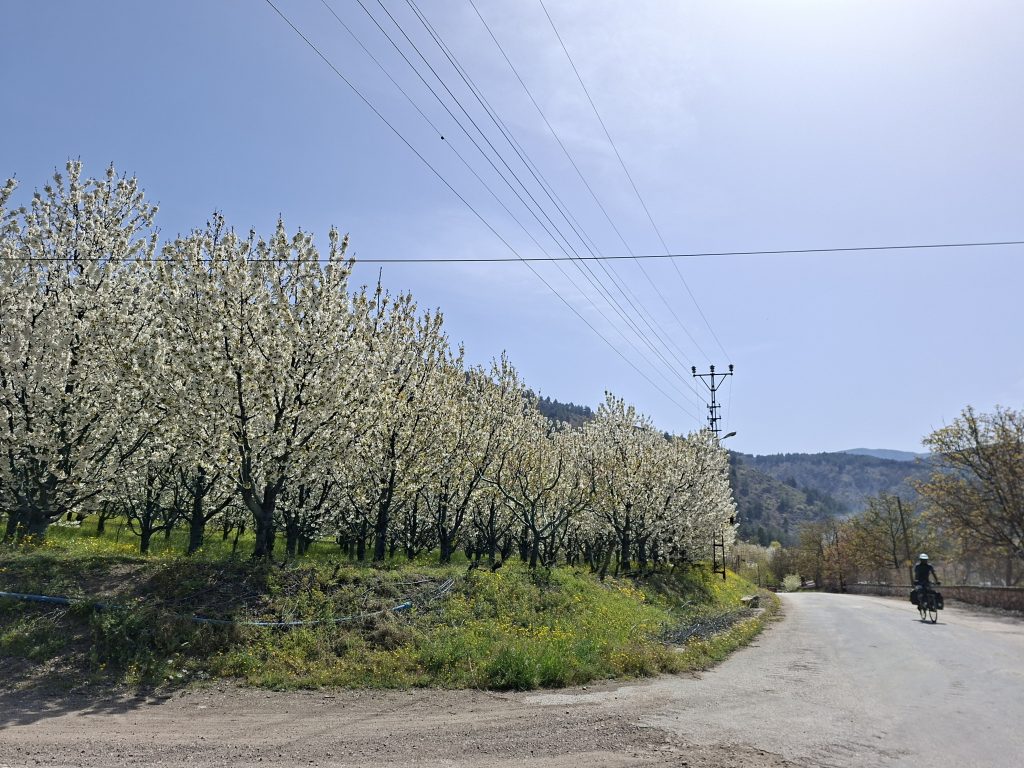 Um 10:17 ging’s los – etwas spät für nach dem Ruhetag und in Anbetracht, dass wir heute bis Samsun fahren wollten. Aber die Zeit sollte schon reichen wenn es einigermassen läuft. Auf dem Rückweg sind wir nicht mehr auf der grossen Strasse gefahren sondern sind auf kleinere ausgewichen. So hatten wir weniger Verkehr und wir fuhren an vielen Obstgärten mit wunderbar blühenden Bäumen vorbei. Die Region ist bekannt für Obst, insbesondere Äpfel, das merkten wir auch am Apfel-Tee, den wir in Amasya unzählige Male manchmal kalt, manchmal heiss serviert bekamen.
