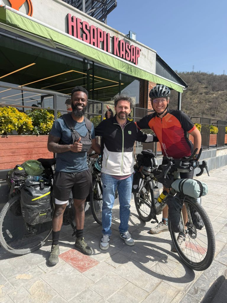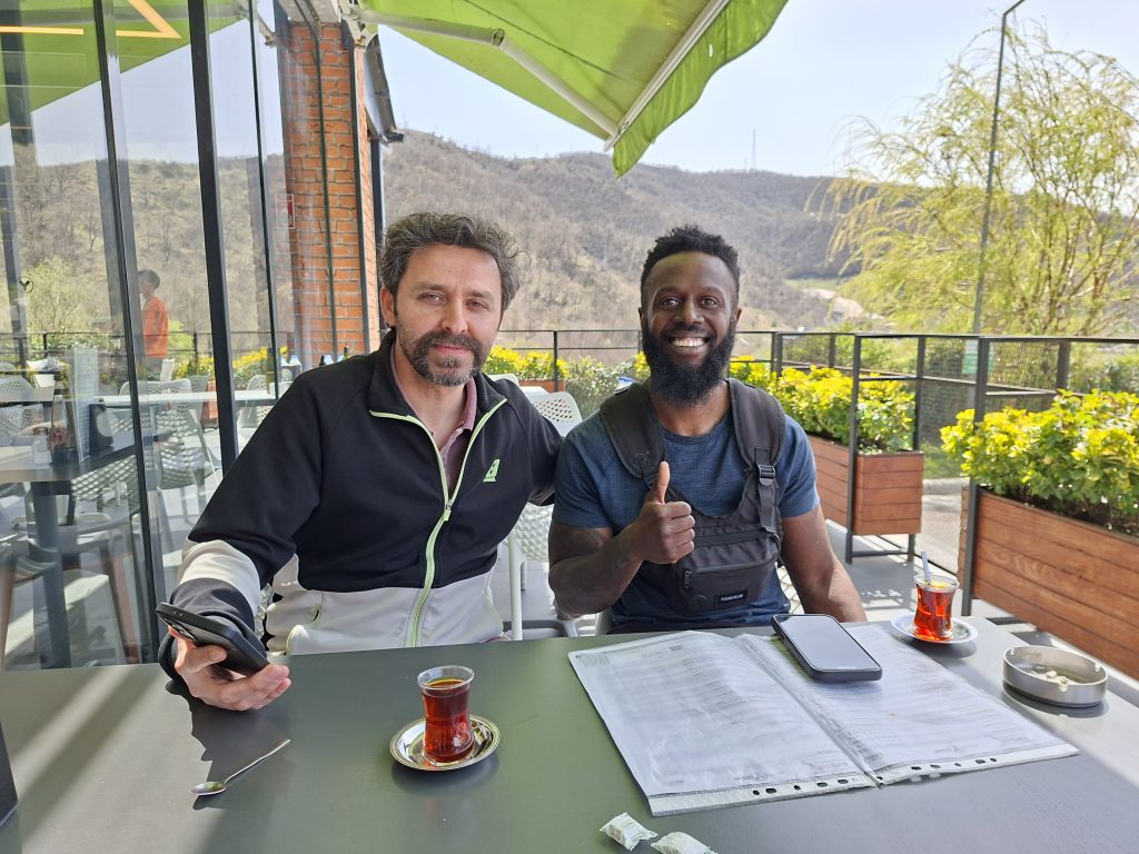 Beim Restaurant angekommen setzten wir uns auf die Terrasse, denn die Temperatur war angenehm warm und nun bestellte Burak Essen für uns. Es stellte sich heraus, dass er uns durch Suluova fahren gesehen hatte und unbedingt mit uns sprechen wollte, weshalb er sich ins Auto setzte und uns folgte. So hatten wir sozusagen gar keine Chance, ihm zu entkommen. Burak betreibt in Suluova eine Game Lounge, arbeitet selber aber vor allem am Abend, da er durch den Tag Angestellte hat. Er habe sich vor etwa einem Jahr ein Fahrrad gekauft und möchte damit auch reisen gehen, allerdings wisse er noch nicht so genau, wie er das anstellen soll. Bis jetzt ging er mit dem Motorrad auf Reisen, nicht aber mit dem Fahrrad. Einaml mehr waren wir froh um unsere Handys für die Übersetzung, denn Burak konnte nicht gut Englisch und wir kaum Türkisch. Nach dem Essen bezahlte Burak alles für uns und lehnte meinen Versuch, etwas dagegen zu unternehmen vehement ab. Wir machten noch ein Foto zusammen und verabschiedeten uns und das war’s dann schon gewesen. Einfach so zum Essen eingeladen. Unglaublich.