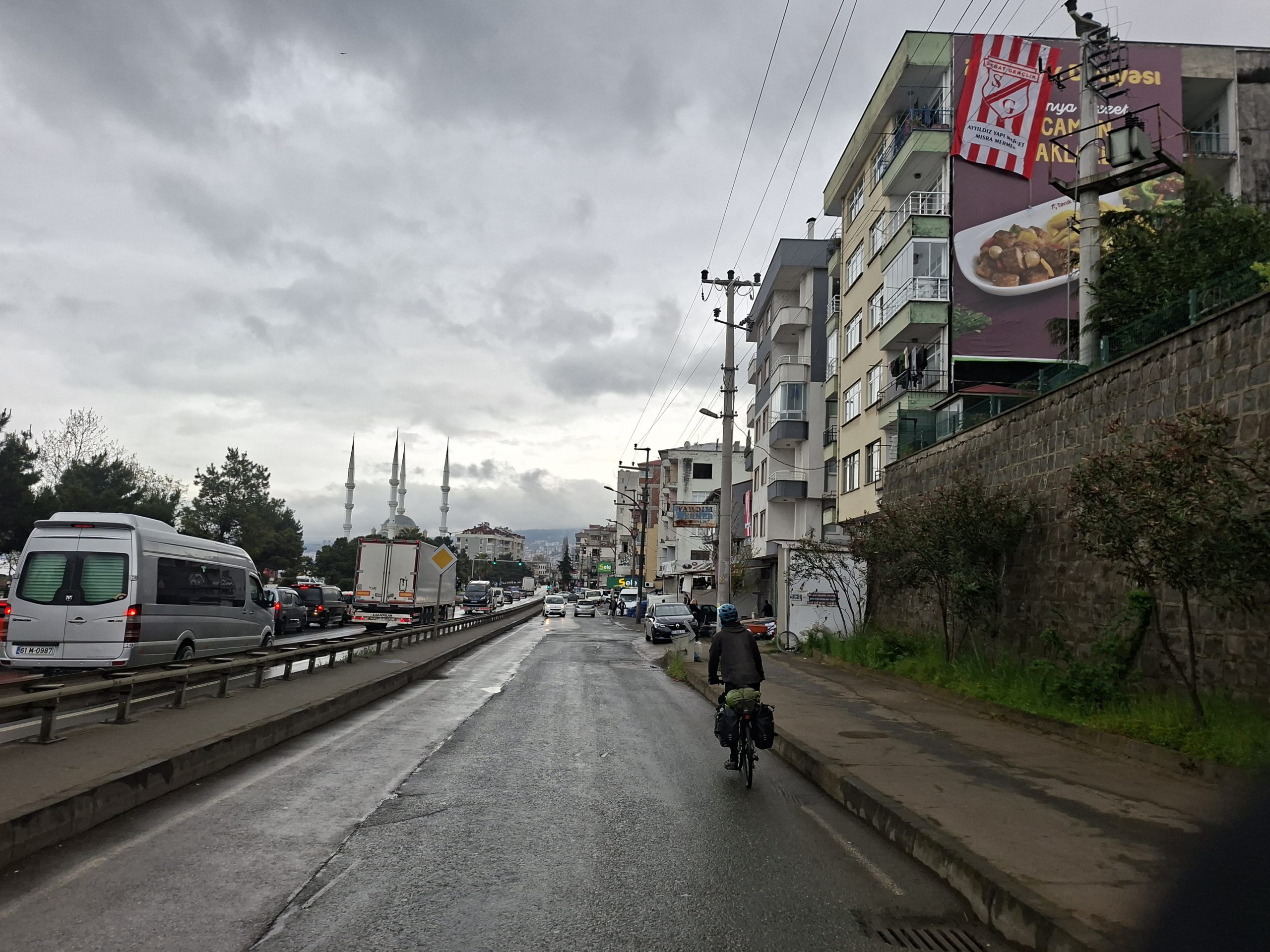 Langsam aber sicher befürchtete ich, dass es heute knapp werden könnte mit einer Ankunft vor Dunkelheit. Wir hatten erst die Hälfte der Kilometer und es war schon bald 17 Uhr. Zum Glück gings im zweiten Teil vor allem bergab – allerdings hatte es auch zwei Gegensteigungen mit je etwa 200 Höhenmetern. Nach der letzten Steigung waren wir immer noch auf über 600 Metern über Meer und es ging nur noch etwa 30 Kilometer bis Samsun. Entsprechend toll war dann die Abfahrt. Ich fuhr etwa 12, 13 Kilometer lang nie unter 40 km/h und manchmal bis zu 60 km/h. Und das ohne gross die Beine zu bewegen. Nur kalt war es nun, denn die Sonne war nun weg. So gingen die letzten Kilometer wie im Flug vorbei, doch vor Einbruch der Dunkelheit schafften wir es trotzdem nicht ans Ziel. Um viertel nach acht kamen wir beim ersten Hotel an, welches ich gestern herausgesucht hatte und wir hatten Glück – es gab noch ein Zimmer für uns und der Preis war auch angemessen. Immerhin das klappte wunderbar und ich war froh, bald eine warem Dusche nehmen zu können. Davor gingen wir aber zuerst noch ein paar Lebensmittel einkaufen – in die Migros natürlich, wenns schon eine in der Nähe gibt.